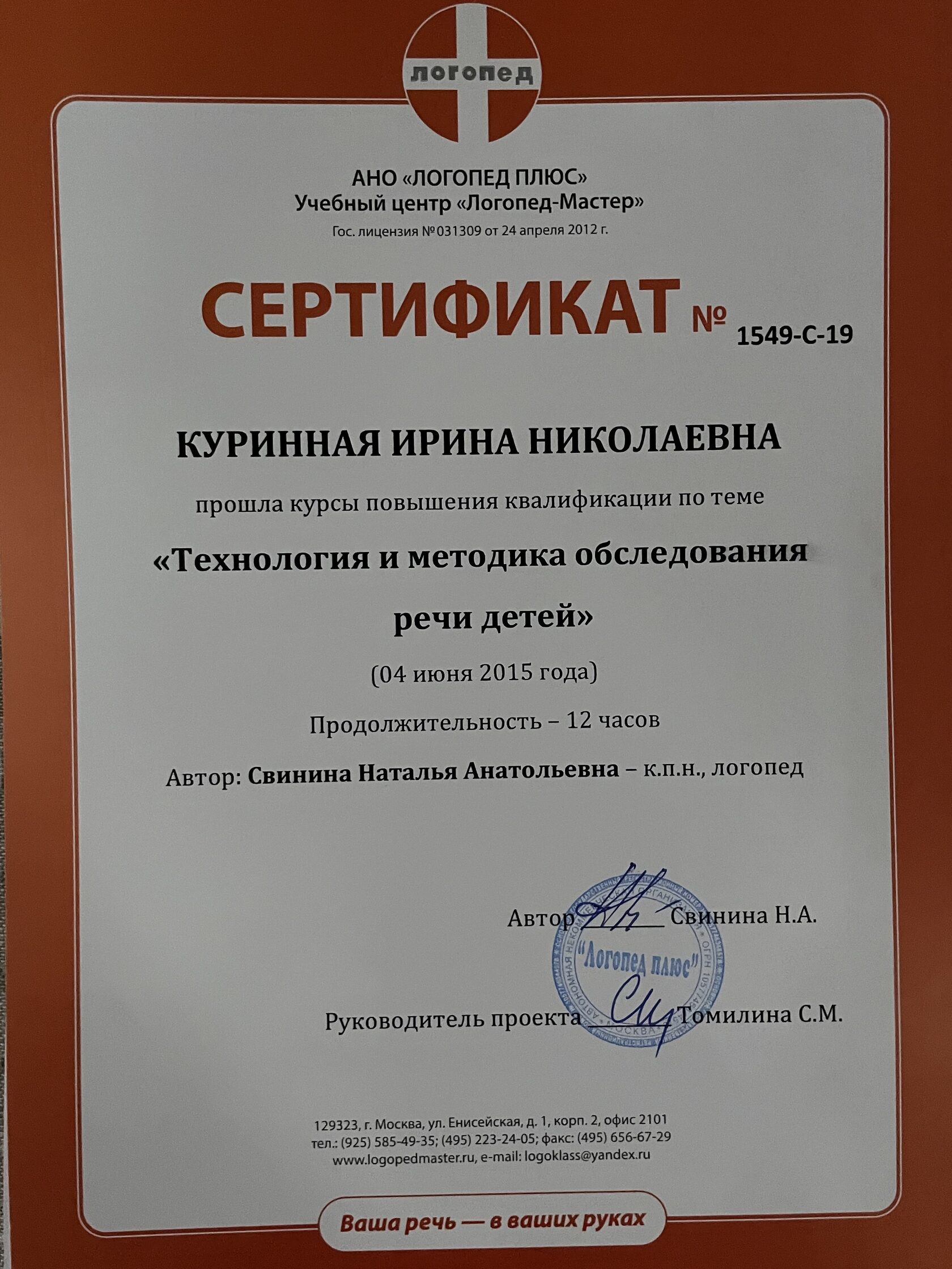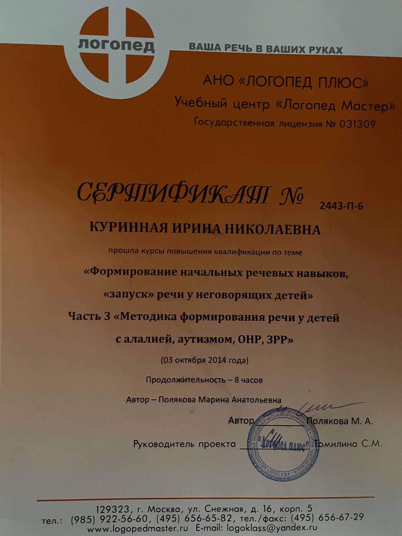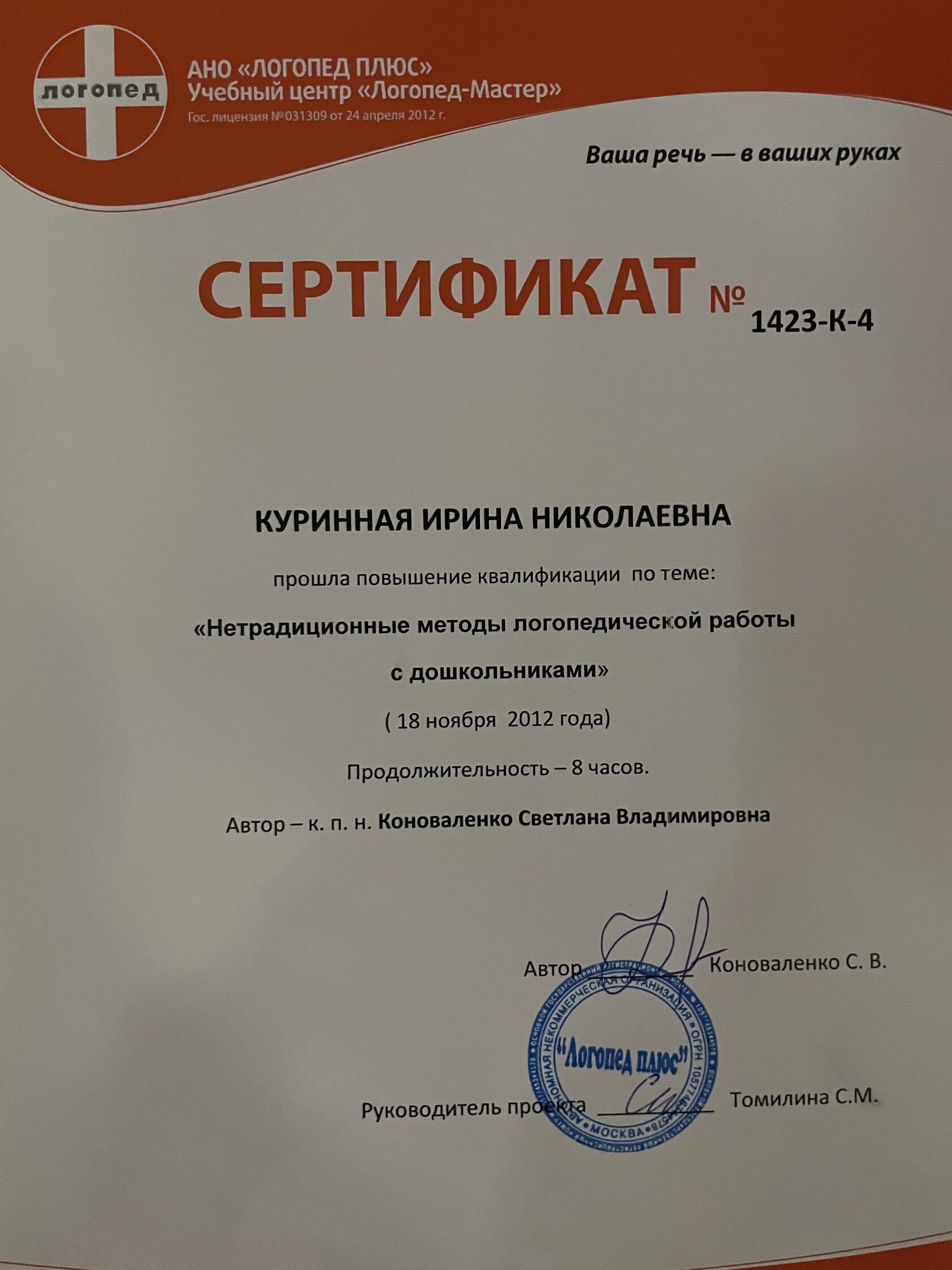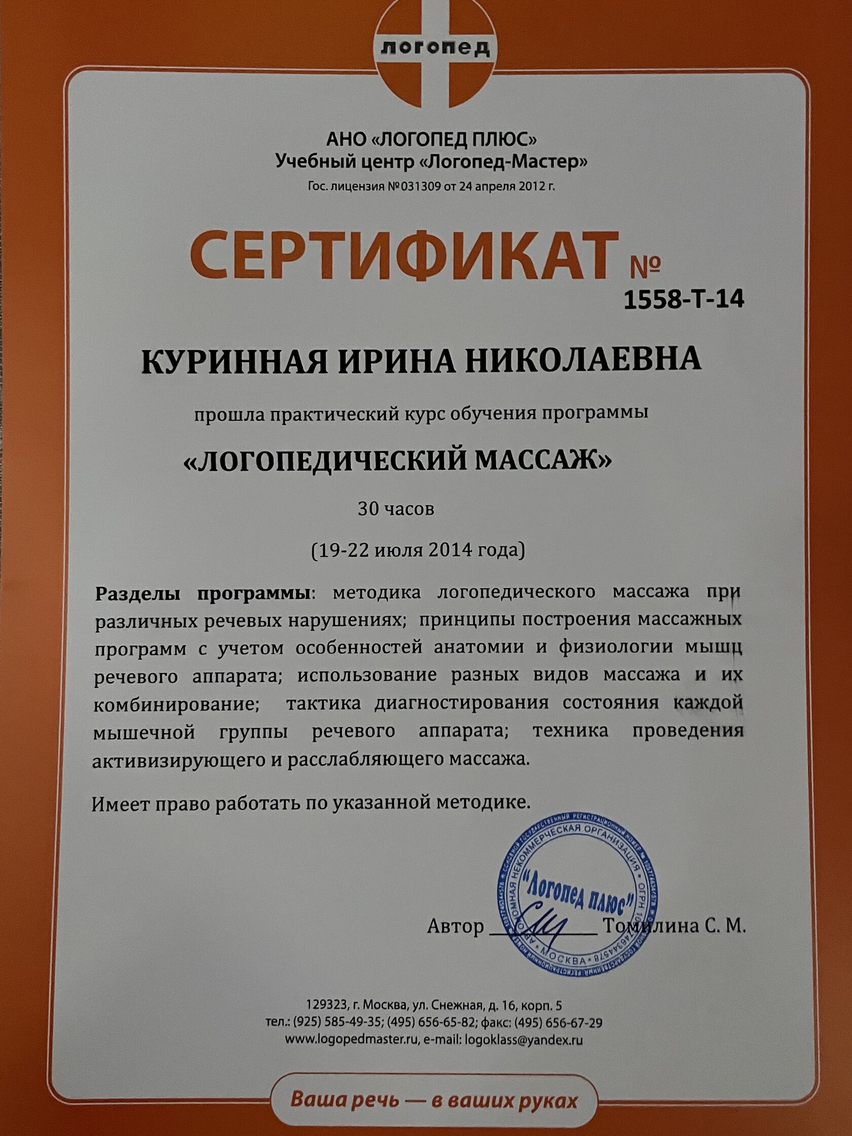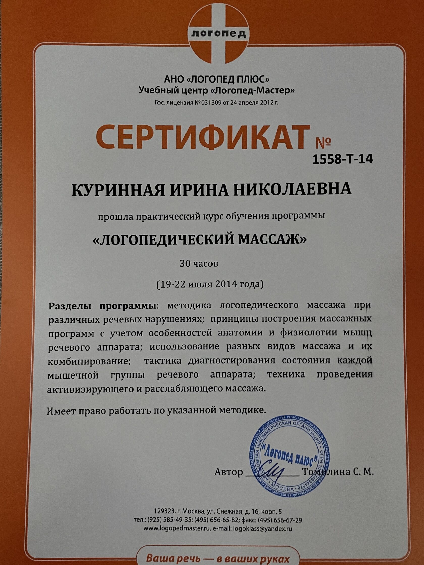 За эти годы мне удалось разработать свой метод развивающих занятий, путем объединения таких направлений, как логопедия, дефектология, нейропсихология, кинезиология и прикладной анализ поведения (ABA). Я продолжаю развивать новые технологии, значительно повышающие уровень развития Вашего ребенка. Такие как, мозжечковая стимуляция на тренажерах, сенсорная интеграция, гимнастика для мозга Пола Деннисона, нейрокоррекция (сенсомоторное развитие) и когнитивная коррекция.